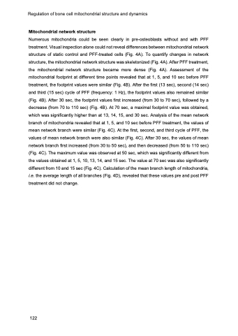 Numerous mitochondria could be seen clearly in pre-osteoblasts without and with PFF treatment. Visual inspection alone could not reveal differences between mitochondrial network structure of static control and PFF-treated cells (Fig. 4A). To quantify changes in network structure, the mitochondrial network structure was skeletonized (Fig. 4A). After PFF treatment, the mitochondrial network structure became more dense (Fig. 4A). Assessment of the mitochondrial footprint at different time points revealed that at 1, 5, and 10 sec before PFF treatment, the footprint values were similar (Fig. 4B). After the first (13 sec), second (14 sec) and third (15 sec) cycle of PFF (frequency: 1 Hz), the footprint values also remained similar (Fig. 4B). After 30 sec, the footprint values first increased (from 30 to 70 sec), followed by a decrease (from 70 to 110 sec) (Fig. 4B). At 70 sec, a maximal footprint value was obtained, which was significantly higher than at 13, 14, 15, and 30 sec. Analysis of the mean network branch of mitochondria revealed that at 1, 5, and 10 sec before PFF treatment, the values of mean network branch were similar (Fig. 4C). At the first, second, and third cycle of PFF, the values of mean network branch were also similar (Fig. 4C). After 30 sec, the values of mean network branch first increased (from 30 to 50 sec), and then decreased (from 50 to 110 sec) (Fig. 4C). The maximum value was observed at 50 sec, which was significantly different from the values obtained at 1, 5, 10, 13, 14, and 15 sec. The value at 70 sec was also significantly different from 10 and 15 sec (Fig. 4C). Calculation of the mean branch length of mitochondria, i.e. the average length of all branches (Fig. 4D), revealed that these values pre and post PFF treatment did not change.