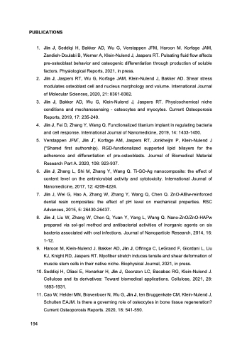 5. Verstappen JFM*, Jin J*, Korfage AM, Jaspers RT, Jonkheijm P, Klein-Nulend J (*Shared first authorship). RGD-functionalized supported lipid bilayers for the adherence and differentiation of pre-osteoblasts. Journal of Biomedical Material Research Part A. 2020, 108: 923-937.