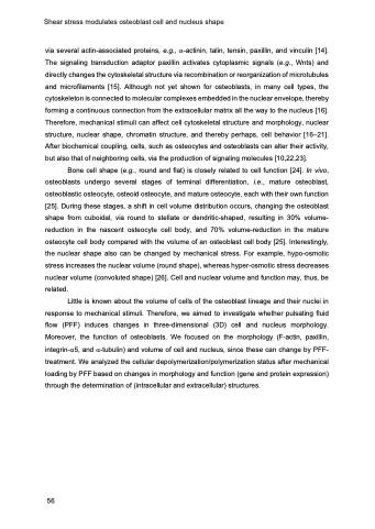 via several actin-associated proteins, e.g., a-actinin, talin, tensin, paxillin, and vinculin [14]. The signaling transduction adaptor paxillin activates cytoplasmic signals (e.g., Wnts) and directly changes the cytoskeletal structure via recombination or reorganization of microtubules and microfilaments [15]. Although not yet shown for osteoblasts, in many cell types, the cytoskeleton is connected to molecular complexes embedded in the nuclear envelope, thereby forming a continuous connection from the extracellular matrix all the way to the nucleus [16]. Therefore, mechanical stimuli can affect cell cytoskeletal structure and morphology, nuclear structure, nuclear shape, chromatin structure, and thereby perhaps, cell behavior [16–21]. After biochemical coupling, cells, such as osteocytes and osteoblasts can alter their activity, but also that of neighboring cells, via the production of signaling molecules [10,22,23].