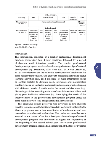 The intervention consisted of a teacher professional development program comprising four, 4-hour meetings, followed by a period of dynamic math interview practice. The teacher professional development program was based on the design features of professional development (e.g., Desimone, 2009; Heck et al., 2019; Van Driel et al., 2012). These features are the collective participation of teachers of the same subject (mathematics) and grade (4), employing active and useful learning activities (e.g., good practices of math interviews), focus on content (related to dynamic math interviews and mathematics teaching), focus on inclusive mathematics classroom practice (coping with different needs of mathematics learners), collaboration (e.g., discussing articles, watching each other’s math interview videos and giving peer feedback), coherence (e.g., identifying the needs of the teachers prior to the professional development program using the same math interview tool) and generous time investment.