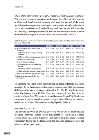 The second research question addressed the effect of the teacher professional development program and practice period of dynamic math interviewing on teachers’ actual mathematics teaching behavior and their perceived math self-efficacy and mathematical knowledge for teaching. Descriptive statistics, means, and standard deviations for the different timepoints of measures, are presented in Table 2.
