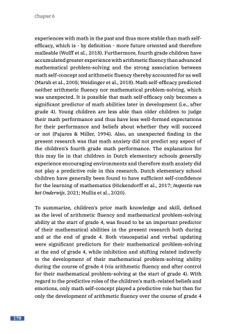 experiences with math in the past and thus more stable than math self- efficacy, which is - by definition - more future oriented and therefore malleable (Wolff et al., 2018). Furthermore, fourth grade children have accumulated greater experience with arithmetic fluency than advanced mathematical problem-solving and the strong association between math self-concept and arithmetic fluency thereby accounted for as well (Marsh et al., 2005; Weidinger et al., 2018). Math self-efficacy predicted neither arithmetic fluency nor mathematical problem-solving, which was unexpected. It is possible that math self-efficacy only becomes a significant predictor of math abilities later in development (i.e., after grade 4). Young children are less able than older children to judge their math performance and thus have less well-formed expectations for their performance and beliefs about whether they will succeed or not (Pajares & Miller, 1994). Also, an unexpected finding in the present research was that math anxiety did not predict any aspect of the children’s fourth grade math performance. The explanation for this may lie in that children in Dutch elementary schools generally experience encouraging environments and therefore math anxiety did not play a predictive role in this research. Dutch elementary school children have generally been found to have sufficient self-confidence for the learning of mathematics (Hickendorff et al., 2017; Inspectie van het Onderwijs, 2021; Mullis et al., 2020).
