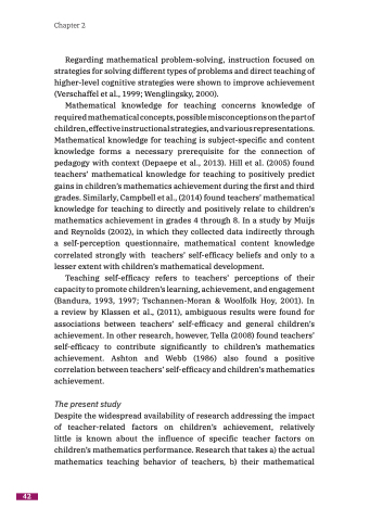 Teaching self-efficacy refers to teachers’ perceptions of their capacity to promote children’s learning, achievement, and engagement (Bandura, 1993, 1997; Tschannen-Moran & Woolfolk Hoy, 2001). In a review by Klassen et al., (2011), ambiguous results were found for associations between teachers’ self-efficacy and general children’s achievement. In other research, however, Tella (2008) found teachers’ self-efficacy to contribute significantly to children’s mathematics achievement. Ashton and Webb (1986) also found a positive correlation between teachers’ self-efficacy and children’s mathematics achievement.
