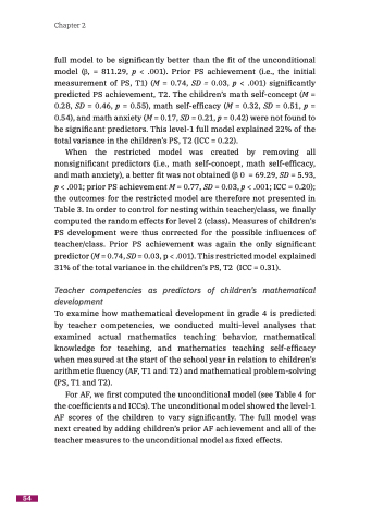 full model to be significantly better than the fit of the unconditional model (β, = 811.29, p < .001). Prior PS achievement (i.e., the initial measurement of PS, T1) (M = 0.74, SD = 0.03, p < .001) significantly predicted PS achievement, T2. The children’s math self-concept (M = 0.28, SD = 0.46, p = 0.55), math self-efficacy (M = 0.32, SD = 0.51, p = 0.54), and math anxiety (M = 0.17, SD = 0.21, p = 0.42) were not found to be significant predictors. This level-1 full model explained 22% of the total variance in the children’s PS, T2 (ICC = 0.22).