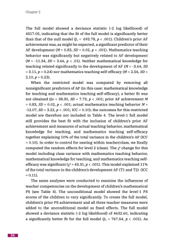The full model showed a deviance statistic (-2 log likelihood) of 4517.05, indicating that the fit of the full model is significantly better than that of the null model (β, = 693.78, p < .001). Children’s prior AF achievement was, as might be expected, a significant predictor of their AF development (M = 0.83, SD = 0.02, p < .001). Mathematics teaching behavior was significantly but negatively related to AF development (M = -11.34, SD = 3.66, p < .01). Neither mathematical knowledge for teaching related significantly to the development of AF (M = -3.64, SD = 3.11, p = 0.24) nor mathematics teaching self-efficacy (M = 2.56, SD = 2.10, p = 0.23).