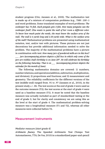 The following mathematics domains are covered: 1) numbers, number relations, and operations (addition, subtraction, multiplication, and division); 2) proportions and fractions; and 3) measurement and geometry. The reliability coefficients for the different versions of the test (middle-end) ranged from .91 to .97 (Janssen et al., 2010), in the present study α = .86. The test scores at the end of grade 4 were used as the outcome measure (T2); the test scores at the start of grade 4 were used as a baseline measure (T1). It must be noted that the baseline measure was actually included as part of standardized testing at the end of grade 3, but for clarity and consistency we are using this as the level at the start of grade 4. The mathematical problem-solving measure was a longitudinal measure (T1 and T2), whereas all other measures were collected before T2.