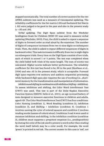 Verbal updating. The Digit Span subtest from the Wechsler Intelligence Scale for Children (WISC-IV) was used to measure verbal updating (Wechsler, 2003). First, the child is asked to repeat a sequence of digits in forward order as read aloud by the examiner. The number of digits of a sequence increases from two to nine digits on subsequent trials. Then, the child is asked to repeat different sequences of digits in backward order. This task increases in difficulty from two to eight digits on subsequent trials. Every item on the Digit Span consists of two trials, each of which is scored 1 or 0 points. The test was completed when the child failed both trials of the same length. The sum of scores was calculated. Higher scores indicate better performance. The reliability coefficient for this test has found to be .88 in the past (Kaufman et al., 2006) and was .65 in the present study, which is acceptable. Forward digit span requires rote memory and auditory sequential processing while backward digit span also requires the use of working (i.e., short- term) memory for the transformation and manipulation of information.