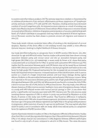 to nicotine and other tobacco products.[18] The immune response in smokers is characterized by an unbalanced production of pro-and anti-inflammatory cytokines, suppression of T lymphocyte activity and lower numbers of Th cells and NK cells. Moreover, smoking women have decreased numbers of cervical Langerhans cells. An impaired immune response as a result of smoking may lead to less effective clearance of CIN lesions. Direct cellular effects of exposure to nicotine include increased cell proliferation, inhibition of apoptosis and stimulation of vascular endothelial growth factor, all of which contribute to oncogenesis and may reduce the potential of lesion regression. [18-20] Moreover, nicotine has been shown to promote cervical cell migration and invasion in vitro.[21]