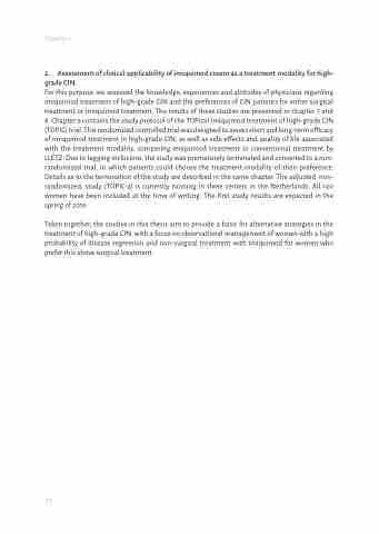 For this purpose, we assessed the knowledge, experiences and attitudes of physicians regarding imiquimod treatment of high-grade CIN and the preferences of CIN patients for either surgical treatment or imiquimod treatment. The results of these studies are presented in chapter 7 and 8. Chapter 9 contains the study protocol of the TOPical Imiquimod treatment of high-grade CIN (TOPIC) trial. This randomized controlled trial was designed to assess short and long-term efficacy of imiquimod treatment in high-grade CIN, as well as side effects and quality of life associated with the treatment modality, comparing imiquimod treatment to conventional treatment by LLETZ. Due to lagging inclusions, the study was prematurely terminated and converted to a non- randomized trial, in which patients could choose the treatment modality of their preference. Details as to the termination of the study are described in the same chapter. The adjusted, non- randomized, study (TOPIC-3) is currently running in three centers in the Netherlands. All 120 women have been included at the time of writing. The first study results are expected in the spring of 2019.