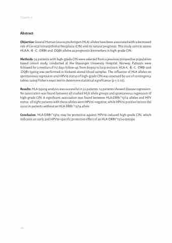 Methods: 34 patients with high-grade CIN were selected from a previous prospective population based cohort study, conducted at the Stavanger University Hospital, Norway. Patients were followed for a median of 112 days follow-up, from biopsy to loop excision. HLA-A, -B, -C, -DRB1 and -DQB1 typing was performed in biobank stored blood samples. The influence of HLA alleles on spontaneous regression and HPV16 status of high-grade CIN was assessed by use of contingency tables, using Fisher’s exact test to determine statistical significance (p ≤ 0.05).