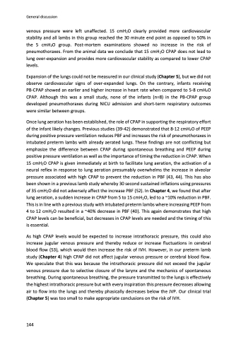As high CPAP levels would be expected to increase intrathoracic pressure, this could also increase jugular venous pressure and thereby reduce or increase fluctuations in cerebral blood flow (53), which would then increase the risk of IVH. However, in our preterm lamb study (Chapter 4) high CPAP did not affect jugular venous pressure or cerebral blood flow. We speculate that this was because the intrathoracic pressure did not exceed the jugular venous pressure due to selective closure of the larynx and the mechanics of spontaneous breathing. During spontaneous breathing, the pressure transmitted to the lungs is effectively the highest intrathoracic pressure but with every inspiration this pressure decreases allowing air to flow into the lungs and thereby phasically decreases below the JVP. Our clinical trial (Chapter 5) was too small to make appropriate conclusions on the risk of IVH.