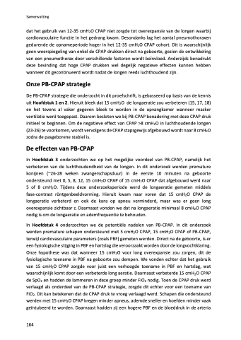 dat het gebruik van 12-35 cmH2O CPAP niet zorgde tot overexpansie van de longen waarbij cardiovasculaire functie in het gedrang kwam. Desondanks lag het aantal pneumothoraxen gedurende de opnameperiode hoger in het 12-35 cmH2O CPAP cohort. Dit is waarschijnlijk geen weerspiegeling van enkel de CPAP drukken direct na geboorte, gezien de ontwikkeling van een pneumothorax door verschillende factoren wordt beïnvloed. Anderzijds benadrukt deze bevinding dat hoge CPAP drukken wel degelijk negatieve effecten kunnen hebben wanneer dit gecontinueerd wordt nadat de longen reeds luchthoudend zijn.