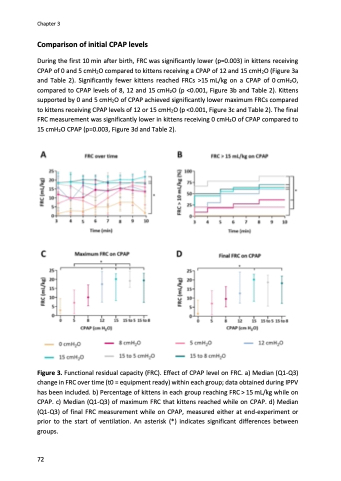 Figure 3. Functional residual capacity (FRC). Effect of CPAP level on FRC. a) Median (Q1-Q3) change in FRC over time (t0 = equipment ready) within each group; data obtained during IPPV has been included. b) Percentage of kittens in each group reaching FRC > 15 mL/kg while on CPAP. c) Median (Q1-Q3) of maximum FRC that kittens reached while on CPAP. d) Median (Q1-Q3) of final FRC measurement while on CPAP, measured either at end-experiment or prior to the start of ventilation. An asterisk (*) indicates significant differences between groups.