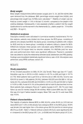 Of the included population (n=590), 81.2% was female. Mean age was 47.7 years. Education was low in 39.5% (n=232), medium in 40.7% (n=240) and high in 19.7% (n=116). Most patients had a part-time or full-time job (n=369, 62,5%). Income was €20,070 or lower in 108 patients (18.3%), between €20,070 and €34,085 in 132 pa- tients (22.4%), between €34,085 and €43,602 in 12.9% (n=76) and €43,602 or higher in 14.9% (n=88). A total of 31.5% of the patients did not want to disclose their income. Most patients had undergone Roux-en-Y gastric bypass (n=511, 86.7%) and mean follow-up was 32 months (range 26-39 months). Mean current BMI was 30.7 kg/m2; this was 45.4 kg/m2 before bariatric surgery. Mean TWL was 32.1% and mean EWL was 74.5%.
