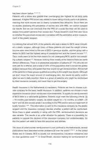 It is striking that almost 40% of the patients who had a desire for BCS never consult- ed a plastic surgeon, although many of these patients did meet the weight criteria. Income rates were linked to the use of BCS in previous studies, and the group with a desire for BCS had the highest rating of unemployment and the lowest income 3,8,16. Thus, costs seem to be the main reason for not undergoing BCS, and/or not consult- ing a plastic surgeon 3,8. However, looking more closely at the reasons there are some distinct differences. There is a substantial population of patients (27.7%) who did not even ask for a referral, and a total of 20% of the population didn’t consult the plastic surgeon because they anticipated that they would not get reimbursement. Almost half of the patients in these groups qualified according to the weight loss results. Although we don’t know the exact amount of overhanging skin, the results do partly confirm what we see in daily practice: there is a group of patients who might be reimbursed by their insurance company, but never tries to get the surgery.