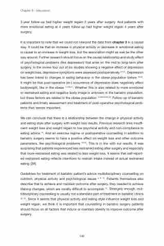 It is important to note that we could not interpret the data from chapter 3 in a causal way. It could be that an increase in physical activity or decrease in emotional eating is causal to an increase in weight loss, but the association might as well be the other way around. Further research should focus on the causal relationship and study effect of psychological problems (like depression) that arise on the mid to long-term after surgery. In the review four out of six studies showing a negative effect of depression on weight loss, depressive symptoms were assessed postoperatively 24-27. Depression has been linked to changes in eating behaviour in the obese population before 28,29. It might be that post-operative (re-) occurrence of depression does negatively affect bodyweight, like in the obese 1,2,30,31. Whether this is also related to more emotional or restrained eating and negative body image is unknown in the bariatric population, but these factors are related in the obese population 1,2,28,30,32,33. Follow-up of bariatric patients and timely assessment and treatment of post-operative psychological prob- lems thus seems important.