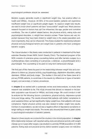 In chapter 2 we started with a systematic review and meta-analysis, to study what research was available so far. This study showed that almost no research in the bar- iatric population was focused on HRQoL and body image. We could conduct a me-f ta-analysis for the following factors: compliance, physical activity, depressive symp-n toms and binge eating. The results showed that patients with better compliance to post-operative follow-up had significantly higher weight loss, than patients with lower compliance. Higher physical activity was also related to better weight loss results. Contrary to expectations, we did not see a negative effect of depressive symptoms or binge-eating on weight loss results. The review also showed that there is great variety in psychological evaluation of bariatric patients.
