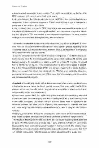 The research in chapter 6 was conducted in the same population as chapter 5. How- ever, now we focused on differences between these patient groups regarding social economic status, qualification for reimbursement of BCS, complaints of overhanging skin and satisfaction with one’s body.