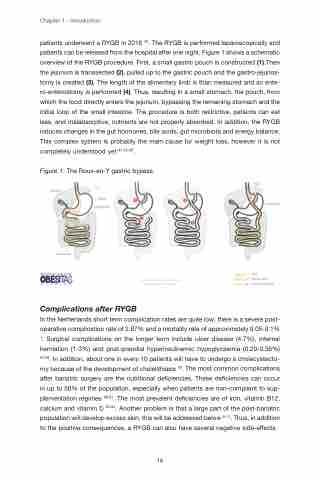 In the Netherlands short term complication rates are quite low; there is a severe post- operative complication rate of 2.87% and a mortality rate of approximately 0.05-0.1% 1. Surgical complications on the longer term include ulcer disease (4.7%), internal herniation (1-3%) and post-prandial hyperinsulinemic hypoglycaemia (0.20-0.36%) 57,58. In addition, about one in every 10 patients will have to undergo a cholecystecto- my because of the development of cholelithiasis 59. The most common complications after bariatric surgery are the nutritional deficiencies. These deficiencies can occur in up to 50% of the population, especially when patients are non-compliant to sup- plementation regimes 60,61. The most prevalent deficiencies are of iron, vitamin B12, calcium and vitamin D 62-64. Another problem is that a large part of the post-bariatric population will develop excess skin, this will be addressed below 8-11. Thus, in addition to the positive consequences, a RYGB can also have several negative side-effects.