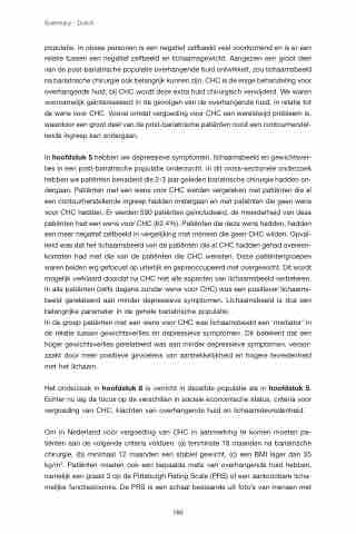 In hoofdstuk 5 hebben we depressieve symptomen, lichaamsbeeld en gewichtsver- lies in een post-bariatrische populatie onderzocht. In dit cross-sectionele onderzoek hebben we patiënten benaderd die 2-3 jaar geleden bariatrische chirurgie hadden on- dergaan. Patiënten met een wens voor CHC werden vergeleken met patiënten die al een contourherstellende ingreep hadden ondergaan en met patiënten die geen wens voor CHC hadden. Er werden 590 patiënten geïncludeerd, de meerderheid van deze patiënten had een wens voor CHC (62.4%). Patiënten die deze wens hadden, hadden een meer negatief zelfbeeld in vergelijking met mensen die geen CHC wilden. Opval- lend was dat het lichaamsbeeld van de patiënten die al CHC hadden gehad overeen- komsten had met die van de patiënten die CHC wensten. Deze patiëntengroepen waren beiden erg gefocust op uiterlijk en gepreoccupeerd met overgewicht. Dit wordt mogelijk verklaard doordat na CHC niet alle aspecten van lichaamsbeeld verbeteren. In alle patiënten (zelfs degene zonder wens voor CHC) was een positiever lichaams- beeld gerelateerd aan minder depressieve symptomen. Lichaamsbeeld is dus een belangrijke parameter in de gehele bariatrische populatie.