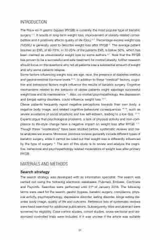 Obese patients frequently report negative perceptions towards their own body, a negative body image, and related cognitive-behavioral consequences 12-16, such as severe avoidance of social situations and low self-esteem, leading to a low QoL 12-14. Experts argue that psychological problems, a lack of physical activity and non-com- pliance to life-style change have a negative impact on weight loss after RYGB 1,17. Though these “moderators” have been studied before, systematic reviews and me- ta-analyses are scarce. Moreover, previous reviews generally include different types of bariatric surgery, while it cannot be ruled out that weight loss is differently influenced by the type of surgery 5. The aim of this study is to review and analyze the cogni- tive, behavioral and psychopathology related moderators of weight loss after primary RYGB.