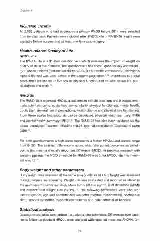 For both questionnaires a high score represents a higher HRQoL and scores range from 0-100. The smallest difference in score, which the patient perceives as benefi- cial, is the minimal clinically important difference (MCID). In previous research with bariatric patients the MCID threshold for RAND-36 was 5, for IWQOL-lite this thresh- old was 12 17.
