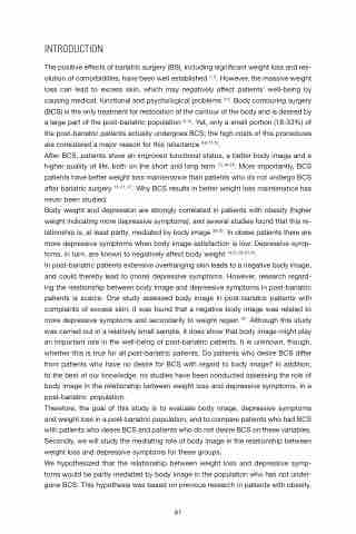 In post-bariatric patients extensive overhanging skin leads to a negative body image, and could thereby lead to (more) depressive symptoms. However, research regard- ing the relationship between body image and depressive symptoms in post-bariatric patients is scarce. One study assessed body image in post-bariatric patients with complaints of excess skin; it was found that a negative body image was related to more depressive symptoms and secondarily to weight regain 34. Although this study was carried out in a relatively small sample, it does show that body image might play an important role in the well-being of post-bariatric patients. It is unknown, though, whether this is true for all post-bariatric patients. Do patients who desire BCS differ from patients who have no desire for BCS with regard to body image? In addition, to the best of our knowledge, no studies have been conducted assessing the role of body image in the relationship between weight loss and depressive symptoms, in a post-bariatric population.