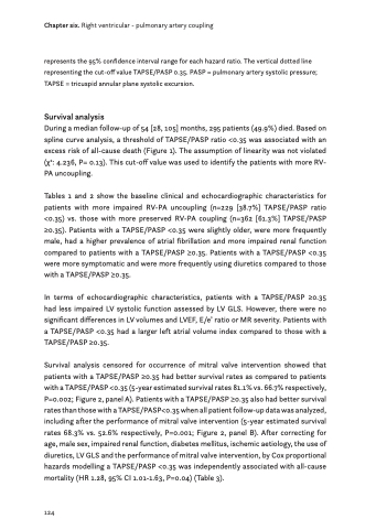 During a median follow-up of 54 [28, 105] months, 295 patients (49.9%) died. Based on spline curve analysis, a threshold of TAPSE/PASP ratio <0.35 was associated with an excess risk of all-cause death (Figure 1). The assumption of linearity was not violated (χ2: 4.236, P= 0.13). This cut-off value was used to identify the patients with more RV- PA uncoupling.