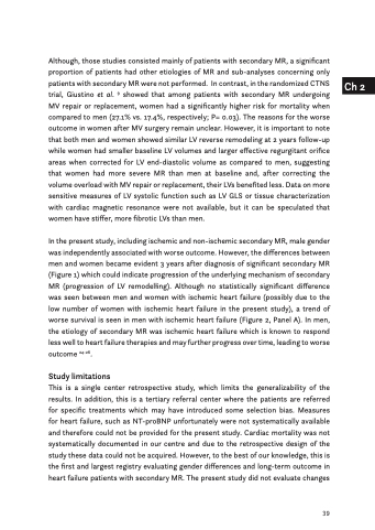 Although, those studies consisted mainly of patients with secondary MR, a significant proportion of patients had other etiologies of MR and sub-analyses concerning only patients with secondary MR were not performed. In contrast, in the randomized CTNS trial, Giustino et al. 9 showed that among patients with secondary MR undergoing MV repair or replacement, women had a significantly higher risk for mortality when compared to men (27.1% vs. 17.4%, respectively; P= 0.03). The reasons for the worse outcome in women after MV surgery remain unclear. However, it is important to note that both men and women showed similar LV reverse remodeling at 2 years follow-up while women had smaller baseline LV volumes and larger effective regurgitant orifice areas when corrected for LV end-diastolic volume as compared to men, suggesting that women had more severe MR than men at baseline and, after correcting the volume overload with MV repair or replacement, their LVs benefited less. Data on more sensitive measures of LV systolic function such as LV GLS or tissue characterization with cardiac magnetic resonance were not available, but it can be speculated that women have stiffer, more fibrotic LVs than men.