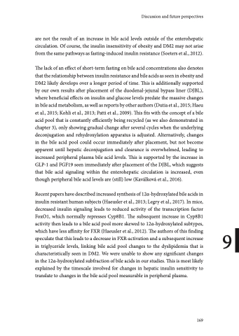 are not the result of an increase in bile acid levels outside of the enterohepatic circulation. Of course, the insulin insensitivity of obesity and DM2 may not arise from the same pathways as fasting-induced insulin resistance (Soeters et al., 2012).
