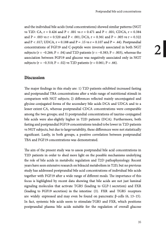 The major findings in this study are: 1) T2D patients exhibited increased fasting and postprandial TBA concentrations after a wide range of nutritional stimuli in comparison with NGT subjects; 2) differences reflected mainly unconjugated and glycine-conjugated forms of the secondary bile acids DCA and UDCA and to a lesser extent CA, whereas postprandial CDCA concentrations were comparable among the two groups; and 3) postprandial concentrations of taurine-conjugated bile acids were also slightly higher in T2D patients (DCA). Furthermore, both fasting and postprandial FGF19 concentrations tended tobe lower in T2D patients vs NGT subjects, but due to largevariability, these differences were not statistically significant. Lastly, in both groups, a positive correlation between postprandial TBA and FGF19 concentrations was demonstrated.