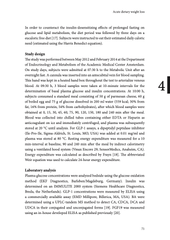 blood. At 09:30 h, 3 blood samples were taken at 10-minute intervals for the determination of basal plasma glucose and insulin concentrations. At 10:00 h, subjects consumed a standard meal consisting of 50 g of parmesan cheese, 60 g of boiled egg and 75 g of glucose dissolved in 200 ml water (559 kcal; 30% from fat, 16% from protein, 54% from carbohydrates), after which blood samples were obtained at 0, 15, 30, 45, 60, 75, 90, 120, 150, 180 and 240 min after the meal. Blood was collected into chilled tubes containing either EDTA or Heparin as anticoagulant on ice and immediately centrifuged, and plasma was subsequently stored at 20 °C until analysis. For GLP-1 assays, a dipeptidyl peptidase inhibitor (Ile-Pro-Ile, Sigma-Aldrich, St. Louis, MO, USA) was added at 0.01 mg/ml and plasma was stored at 80 °C. Resting energy expenditure was measured for a 10 min-interval at baseline, 90 and 240 min after the meal by indirect calorimetry using a ventilated hood system (Vmax Encore 29; SensorMedics, Anaheim, CA). Energy expenditure was calculated as described by Frayn [18]. The abbreviated Weir equation was used to calculate 24-hour energy expenditure.