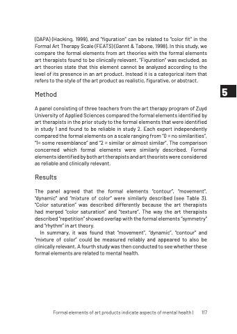 (DAPA) (Hacking, 1999), and “figuration” can be related to “color fit” in the Formal Art Therapy Scale (FEATS) (Gannt & Tabone, 1998). In this study, we compare the formal elements from art theories with the formal elements art therapists found to be clinically relevant. “Figuration” was excluded, as art theories state that this element cannot be analyzed according to the level of its presence in an art product. Instead it is a categorical item that refers to the style of the art product as realistic, figurative, or abstract.