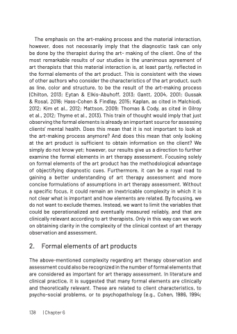 The above-mentioned complexity regarding art therapy observation and assessment could also be recognized in the number of formal elements that are considered as important for art therapy assessment. In literature and clinical practice, it is suggested that many formal elements are clinically and theoretically relevant. These are related to client characteristics, to psycho-social problems, or to psychopathology (e.g., Cohen, 1986, 1994;