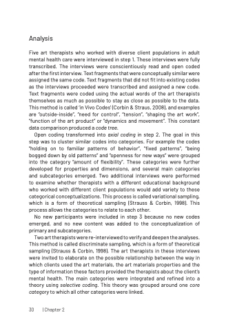 Open coding transformed into axial coding in step 2. The goal in this step was to cluster similar codes into categories. For example the codes “holding on to familiar patterns of behavior”, “fixed patterns”, “being bogged down by old patterns” and “openness for new ways” were grouped into the category “amount of flexibility”. These categories were further developed for properties and dimensions, and several main categories and subcategories emerged. Two additional interviews were performed to examine whether therapists with a different educational background who worked with different client populations would add variety to these categorical conceptualizations. This process is called variational sampling, which is a form of theoretical sampling (Strauss & Corbin, 1998). This process allows the categories to relate to each other.