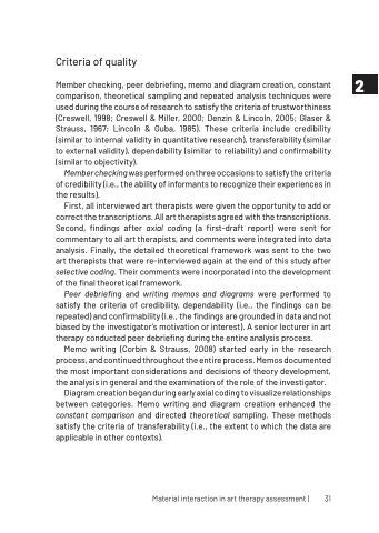Peer debriefing and writing memos and diagrams were performed to satisfy the criteria of credibility, dependability (i.e., the findings can be repeated) and confirmability (i.e., the findings are grounded in data and not biased by the investigator’s motivation or interest). A senior lecturer in art therapy conducted peer debriefing during the entire analysis process.