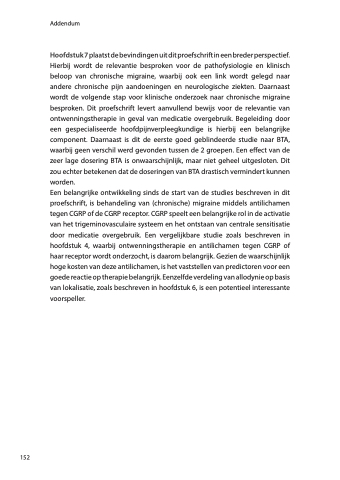 Hoofdstuk 7 plaatst de bevindingen uit dit proefschrift in een breder perspectief. Hierbij wordt de relevantie besproken voor de pathofysiologie en klinisch beloop van chronische migraine, waarbij ook een link wordt gelegd naar andere chronische pijn aandoeningen en neurologische ziekten. Daarnaast wordt de volgende stap voor klinische onderzoek naar chronische migraine besproken. Dit proefschrift levert aanvullend bewijs voor de relevantie van ontwenningstherapie in geval van medicatie overgebruik. Begeleiding door een gespecialiseerde hoofdpijnverpleegkundige is hierbij een belangrijke component. Daarnaast is dit de eerste goed geblindeerde studie naar BTA, waarbij geen verschil werd gevonden tussen de 2 groepen. Een effect van de zeer lage dosering BTA is onwaarschijnlijk, maar niet geheel uitgesloten. Dit zou echter betekenen dat de doseringen van BTA drastisch vermindert kunnen worden.