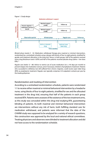According to a centralized randomization schedule, patients were randomized 1:1 to receive either maximal or minimal behavioral intervention by a headache nurse, using blocks of four to eight patients, stratified for sex and the allocated treatment in the drug trial, ensuring that half of the patients in each group received BTA. Patients were unaware of the existence of the two treatment arms, as this study was concealed within this drug trial studying BTA, guaranteeing blinding of patients. As both maximal and minimal behavioral intervention are interventions without any risk of harm, both fulfilling standard care for medication withdrawal, and patients were informed that the data of the CHARM study was supposed to be analyzed for a variety of research questions, this construction was approved by the local and national ethical committees. Treating physicians and observers were blinded to treatment allocation and did not have access to the randomization schedule.