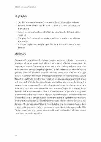 To manage the potential conflict between outdoor recreation and nature conservation, managers of nature areas need information to select effective interventions. For large nature areas information on visitor use is often lacking and managers often make decisions based on expert judgement. In this paper we use monitoring data gathered with GPS devices to develop a tool and derive rules of thumb managers can use to estimate the impact of management actions on visitor densities. Using a dataset of 1563 tracks from the New Forest, UK, we developed a random forest model and identified which landscape and environmental features account for the spatial variation in visitor densities. The random forest model shows that distance to car park, distance to roads and openness are the most important factors for predicting visitor densities. The model was used as a tool to assess the impact of potential management interventions on the population of Nightjar. As developing this type of tool requires a lot of data we also derived rules of thumb and a simple algorithm that managers of other nature areas can use to estimate the impact of their interventions on visitor densities. The derived rules of thumb show that changing the location of car parks in relation to tarmac roads can help managers to reduce local visitor densities by 80%. Further research in other nature areas should verify the feasibility of these rules of thumb and the simple algorithm.