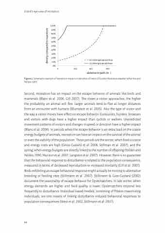 Second, recreation has an impact on the escape behavior of animals like birds and mammals (Blanc et al. 2006, Gill 2007). The closer a visitor approaches, the higher the probability an animal will flee. Larger animals tend to flee at longer distances from an encounter with humans (Blumstein et al. 2005). Also the type of visitor and the way a visitor moves have effect on escape behavior. Ecotourists, hunters, browsers and visitors with dogs have a higher impact than cyclists or walkers. Unpredicted movement patterns of visitors and changes in speed or direction have a higher impact (Blanc et al. 2006). In periods when the escape behavior is an extra load on the scarce energy budgets of animals, recreation can have an impact on the survival of the animal or even the viability of the population. These periods are the winter, when food is scarce and energy costs are high (Gross-Custard et al. 2006, Stillman et al. 2007), and the spring, when energy budgets are directly linked to the number of offspring (Yalden and Yalden 1990, Murison et al. 2007, Langston et al. 2007). However, there is no guarantee that the behavioral response to disturbance is related to the population consequence, measured in terms of decreased reproduction or increased mortality (Gill et al. 2001). Birds exhibiting an escape behavioral response might actually be moving to alternative breeding or feeding sites (Stillmann et al. 2007). Stillmann & Goss-Custard (2002) document the seasonality of escape behavior for Oystercatchers. In late winter, when energy demands are higher and food quality is lower, Oystercatchers respond less frequently to disturbance. Individual based models, consisting of fitness-maximizing individuals, are one means of linking disturbance induced behavioral responses to population consequences (West et al. 2002, Stillmann et al. 2007).