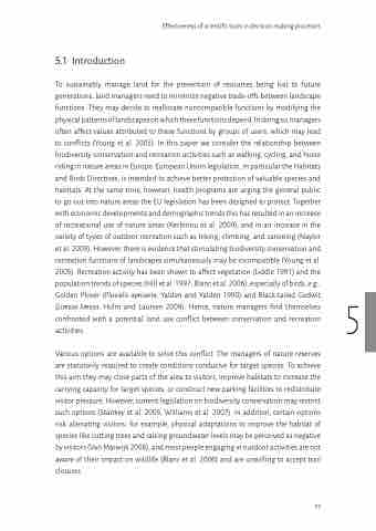 Various options are available to solve this conflict. The managers of nature reserves are statutorily required to create conditions conducive for target species. To achieve this aim they may close parts of the area to visitors, improve habitats to increase the carrying capacity for target species, or construct new parking facilities to redistribute visitor pressure. However, current legislation on biodiversity conservation may restrict such options (Stankey et al. 2005, Williams et al. 2007). In addition, certain options risk alienating visitors; for example, physical adaptations to improve the habitat of species like cutting trees and raising groundwater levels may be perceived as negative by visitors (Van Marwijk 2008), and most people engaging in outdoor activities are not aware of their impact on wildlife (Blanc et al. 2006) and are unwilling to accept trail closures.