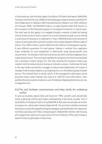 To serve as boundary objects (Star and Griesemer 1989), scientific tools should help clarify underlying conflicts and create understanding of the issues at stake. One of the benefits of simulation tools such as MASOOR is that users can actually see visitors moving across a dense path network (Appendix 8). The animation interface projected the results on aerial photographs and gave managers and stakeholders the impression that they could play with it like a computer game. Stakeholders familiar with the area will recognize the output and can get used to the tools (Kleijnen 1995), which makes it easier for them to participate in the process.