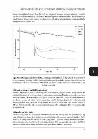 However, the addition of extracts of c.p.Mg rapidly and consistently decreased resistance, indicating a complete loss of endothelial interconnectivity. Extracts from the coated Mg decreased transendothelial resistance to a lesser extent, however, although some recovery was observed, the cells did not return to baseline resistance and had a decrease in resistance close to 50%.