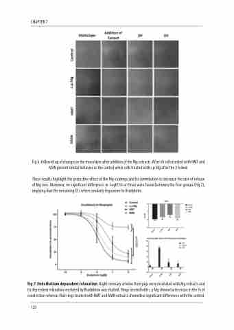 Fig.7. Endothelium dependent relaxation. Right coronary arteries from pigs were incubated with Mg extracts and its dependent relaxation mediated by Bradykinin was studied. Rings treated with c.p Mg showed a decrease in the % of constriction whereas that rings treated with HMT and MAN extracts showed no significant differences with the control.