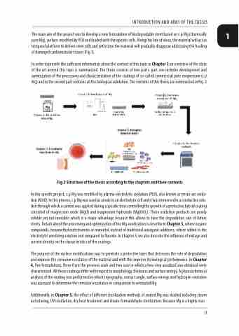 In order to provide the sufficient information about the context of this topic in Chapter 2 an overview of the state of the art around this topic is summarized. The thesis consists of two parts: part one includes development and optimization of the processing and characterization of the coatings of so-called commercial pure magnesium (c.p Mg) and in the second part contains all the biological validation. The contents of this thesis are summarized in Fig. 2
