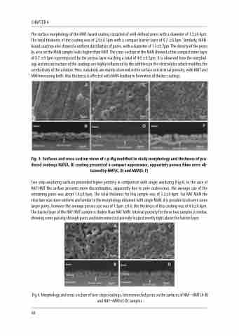 Fig. 3. Surfaces and cross-section views of c.p Mg modified to study morphology and thickness of pro- duced coatings NAF(A, B) coating presented a compact appearance, oppositely porous films were ob- tained by HMT(C, D) and MAN(E, F)