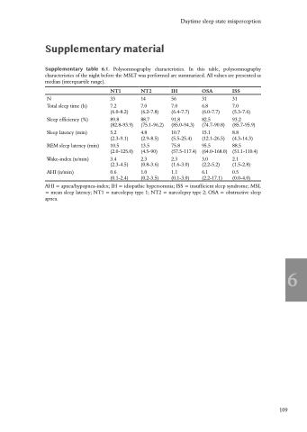 Supplementary table 6.1. Polysomnography characteristics. In this table, polysomnography characteristics of the night before the MSLT was performed are summarized. All values are presented as median (interquartile range).
