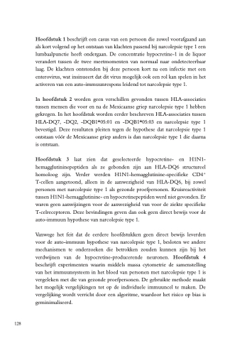 Hoofdstuk 3 laat zien dat geselecteerde hypocretine- en H1N1- hemagglutininepeptiden als ze gebonden zijn aan HLA-DQ6 structureel homoloog zijn. Verder werden H1N1-hemagglutinine-specifieke CD4+ T-cellen aangetoond, alleen in de aanwezigheid van HLA-DQ6, bij zowel personen met narcolepsie type 1 als gezonde proefpersonen. Kruisreactiviteit tussen H1N1-hemagglutinine- en hypocretinepeptiden werd niet gevonden. Er waren geen aanwijzingen voor de aanwezigheid van voor de ziekte specifieke T-celreceptoren. Deze bevindingen geven dan ook geen direct bewijs voor de auto-immuun hypothese van narcolepsie type 1.