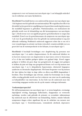 Hoofdstuk 5 beschrijft hiertoe een onderzoek bij mensen met narcolepsie type 1 die beginnen met het gebruik van natriumoxybaat. We vergeleken het effect van dit middel op het gewicht in vergelijking met de gewichtsverandering bij mensen die modafinil begonnen te gebruiken. Natriumoxybaat, een medicament dat gebruikt wordt voor de behandeling van alle kernsymptomen van narcolepsie type 1, bleek tevens voor een significant grotere gewichtsreductie te zorgen dan modafinil. Zowel voor de gewichtstoename als symptoom van narcolepsie type 1 als voor de gewichtsafname door het gebruik van natriumoxybaat is nog niet afdoende verklaring. Preklinisch onderzoek suggereert echter dat er een rol is voor veranderingen in activatie van bruin vetweefsel, verantwoordelijk voor een groot deel van de warmteproductie in het lichaam, in narcolepsie type 1.