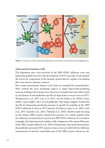 Since many autoimmune disease in the brain are mediated by autoantibodies, these seemed the most promising suspect to target hypocretin-producing neurons, leading to their destruction. However, no studies have been able to find an enrichment of autoantibodies specific for hypocretin or its precursor in NT1 (Giannoccaro et al., 2017, Luo et al., 2017, van der Heide et al., 2015a). Some studies report higher titres of autoantibodies that target antigens moderately specific for hypocretin-producing neurons or specific for peptides in the 2009 H1N1 influenza A virus in NT1 patients (Cvetkovic-Lopes et al., 2010, Lind et al., 2017, Saariaho et al., 2015, Thebault et al., 2015). Another study focusing on the human OX2 receptor reported the presence of a mimic peptide from the influenza nucleoprotein A, used in the 2009 H1N1 influenza A vaccination campaign, that shared protein residues with a fragment of the extracellular part of the OX2 receptor (Ahmed et al., 2015). Furthermore, this study demonstrates that antibodies present in NT1 patient serum cross-react with both the influenza nucleoprotein A and the extracellular part of the OX2 receptor. However, the